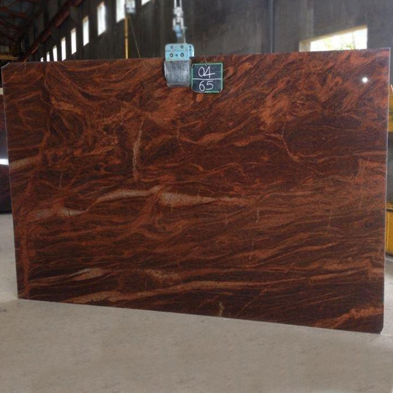 This red granite product has an orange-red background with multiple swirls and waves in dark greenish-grey and black tones. Quarried in South India, this granite has seldom patches in white and light grey hues. Steps, risers, and countertops are some of its popular products.
